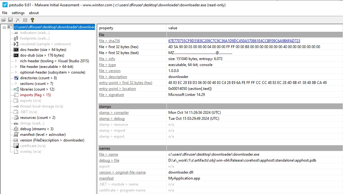 First, we will launch PeStudio and load the executable into it. The shortcut for this has been placed on the Desktop of your analyst machine. You can drag and drop the executable into the PeStudio window, or load it by selecting File -> Open File from the toolbar. PeStudio will display some information about the executable.