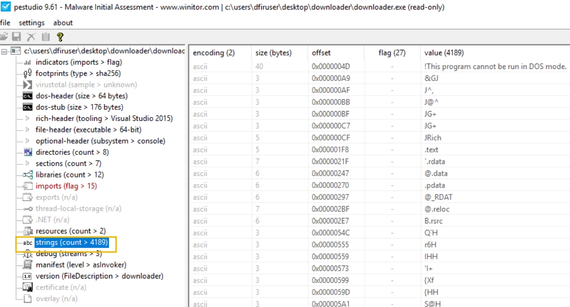 Next, we will proceed with reviewing the "Strings" of the executable. You can do this by clicking on the "strings" indicator on the left pane of PeStudio.
