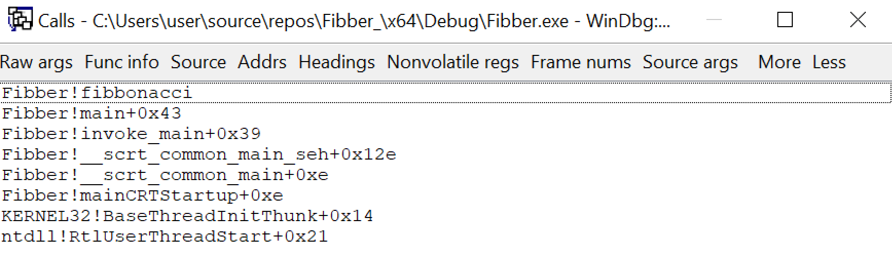 e.g. when breaking at the entrypoint of fibbonacci() in the debug build of Fibber.exe, k yields the following output.